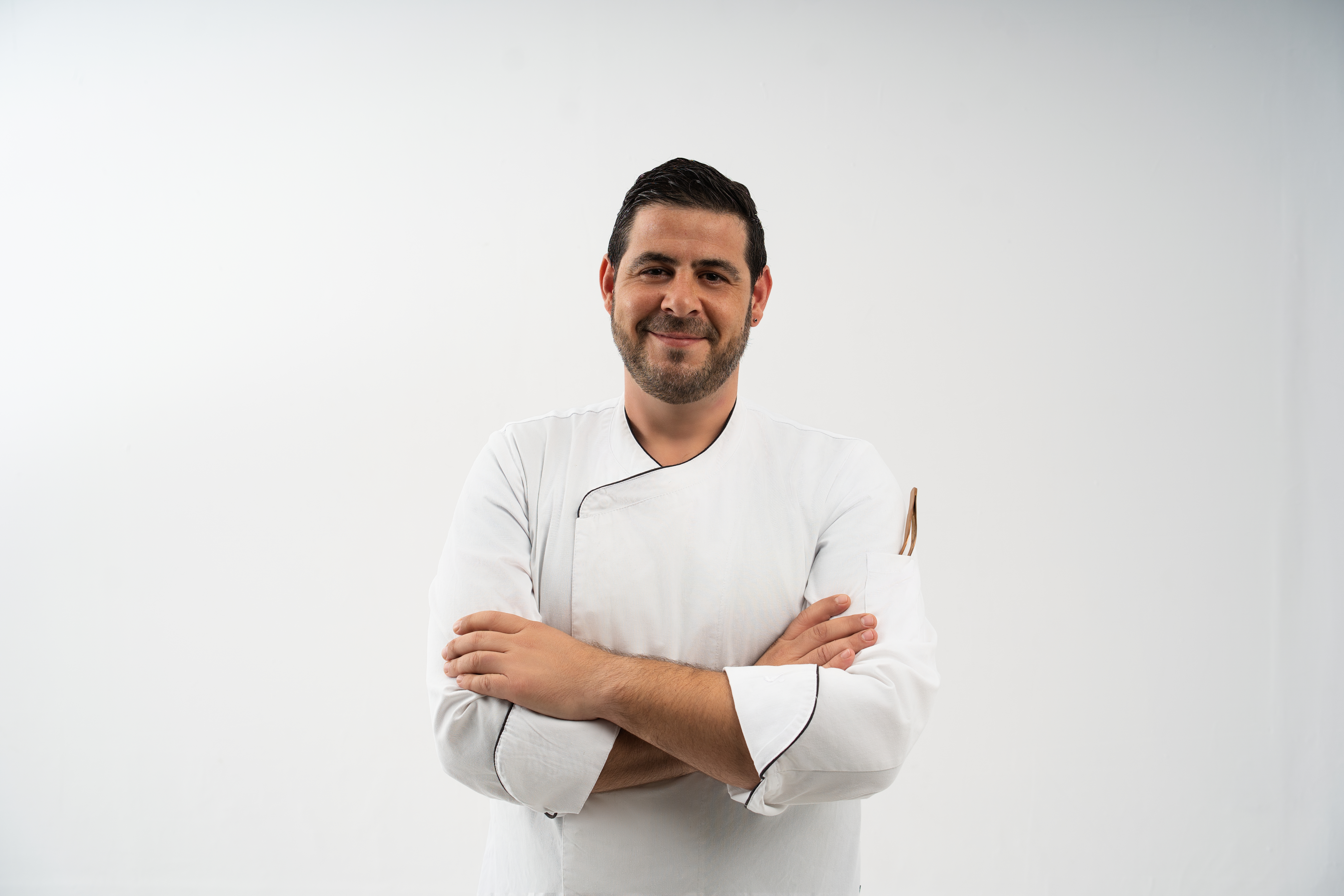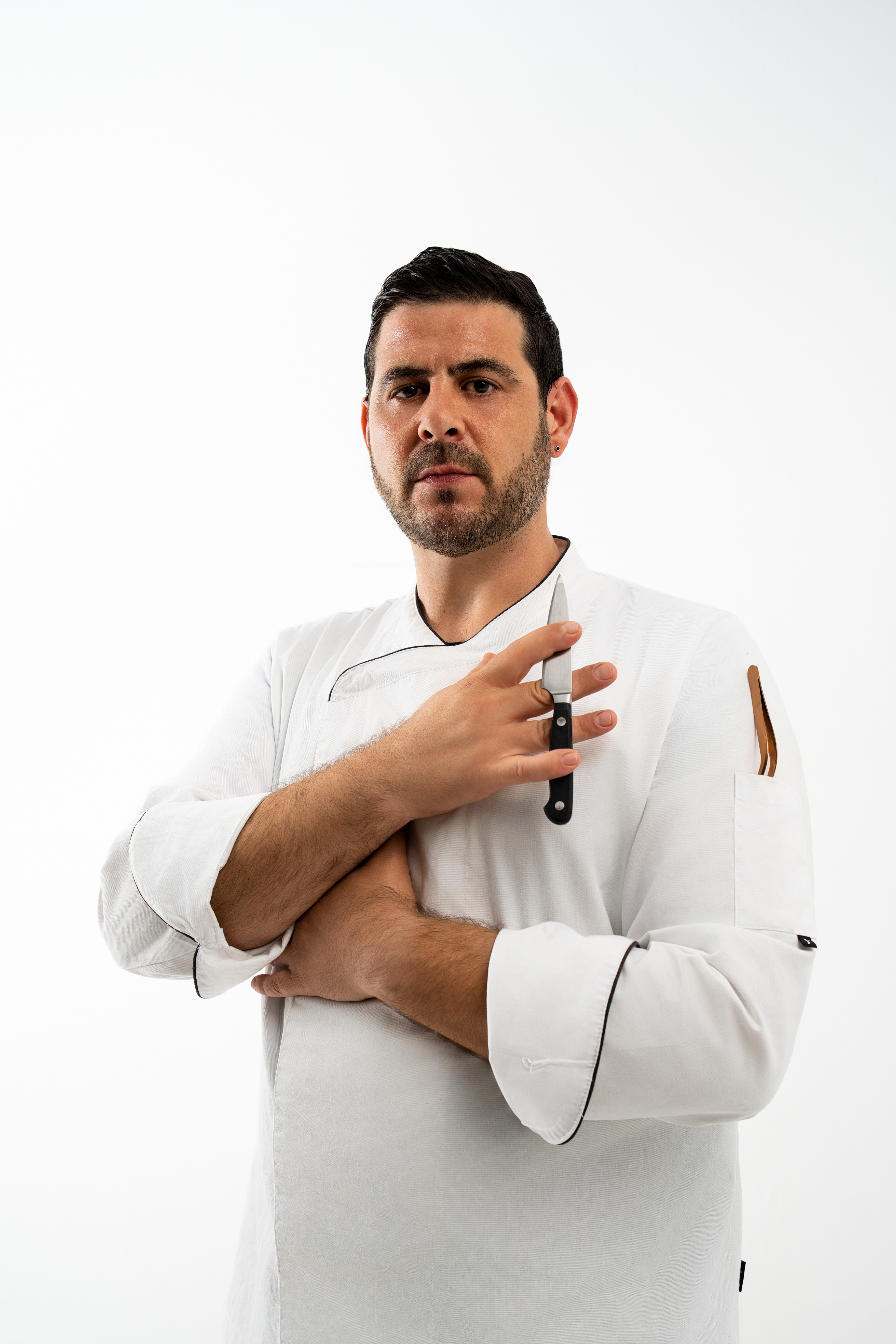 - Retratos de Victor en estudio, con utensilios y elementos de servicio que refuerzan su identidad de chef profesional.